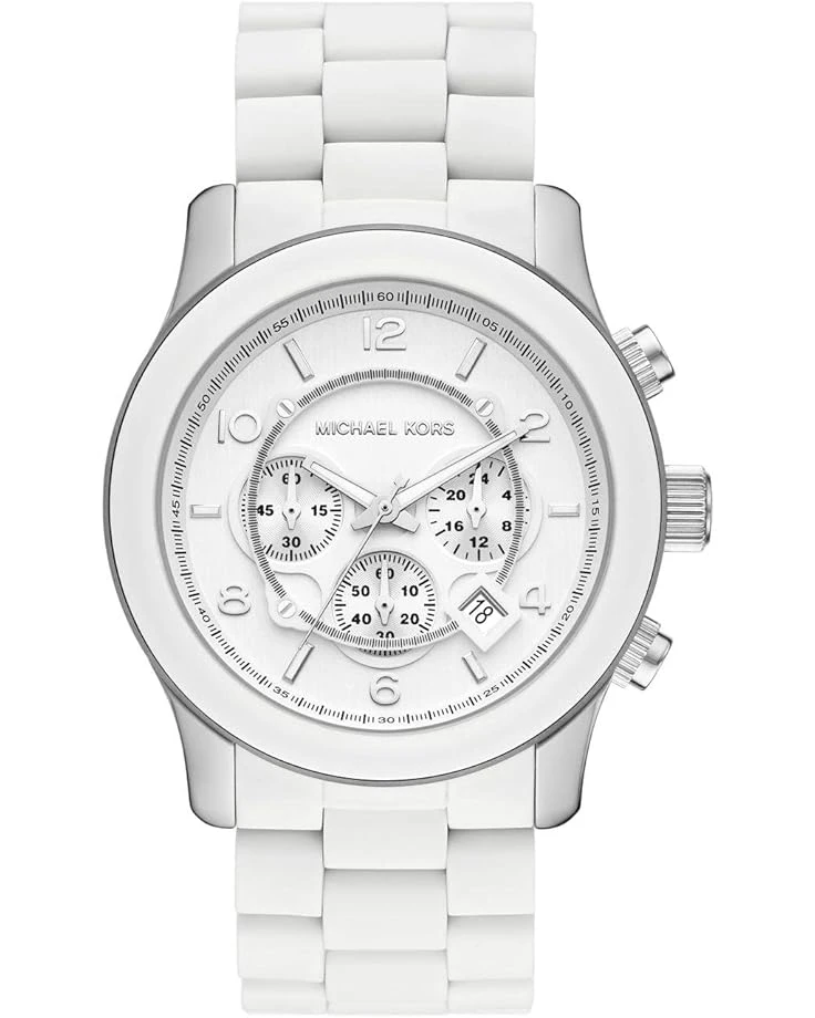 The versatile Michael Kors® MK9076 – Runway Chronograph Watch has a sporty and bold look. SKU: #9881644Stainless steel construction.Bracelet deployant closure.