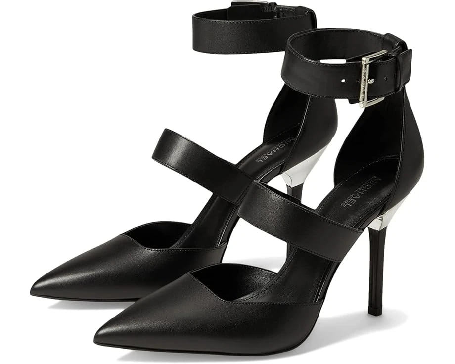 Make a head-turning statement wherever you head wearing the MICHAEL Michael Kors® Amal Pump. SKU: #9821832Smooth and glossy man-made upper. Man-made lining with a cushioned footbed. Wide ankle strap with adjustable buckle closure on it. Pointed toe silhouette. Metallic stud accents on the foot and the ankle strap. Closed-back design for added support.High stiletto heel. Durable rubber outsole. Imported. Product measurements were taken using size 9, width M. Please note that measurements may vary by size.Measurements: