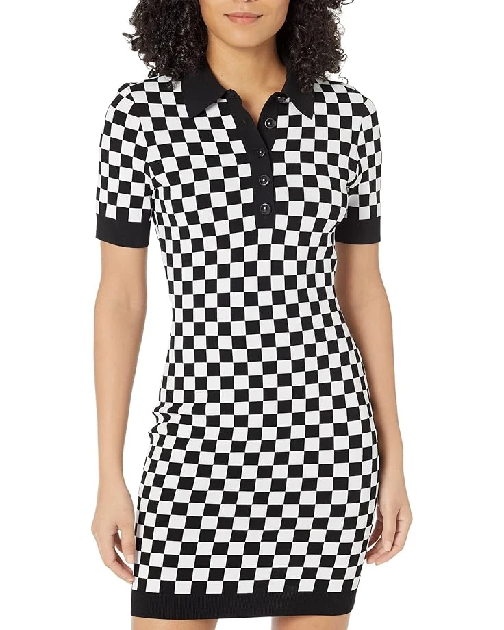 Bring on an effortless touch to your style by opting for the MICHAEL Michael Kors® Eco Check Midi Dress. SKU: #9870734Mini-length dress in a slim-fit silhouette. Collared neckline with buttoned placket. Short sleeves. Contrasting trims on the neckline, armbands, and hemline with rib-knit pattern. Straight hemline. Checkerboard pattern throughout. 79% viscose, 17% polyester, 3% other fibers, 1% elastane. Machine wash, dry flat.