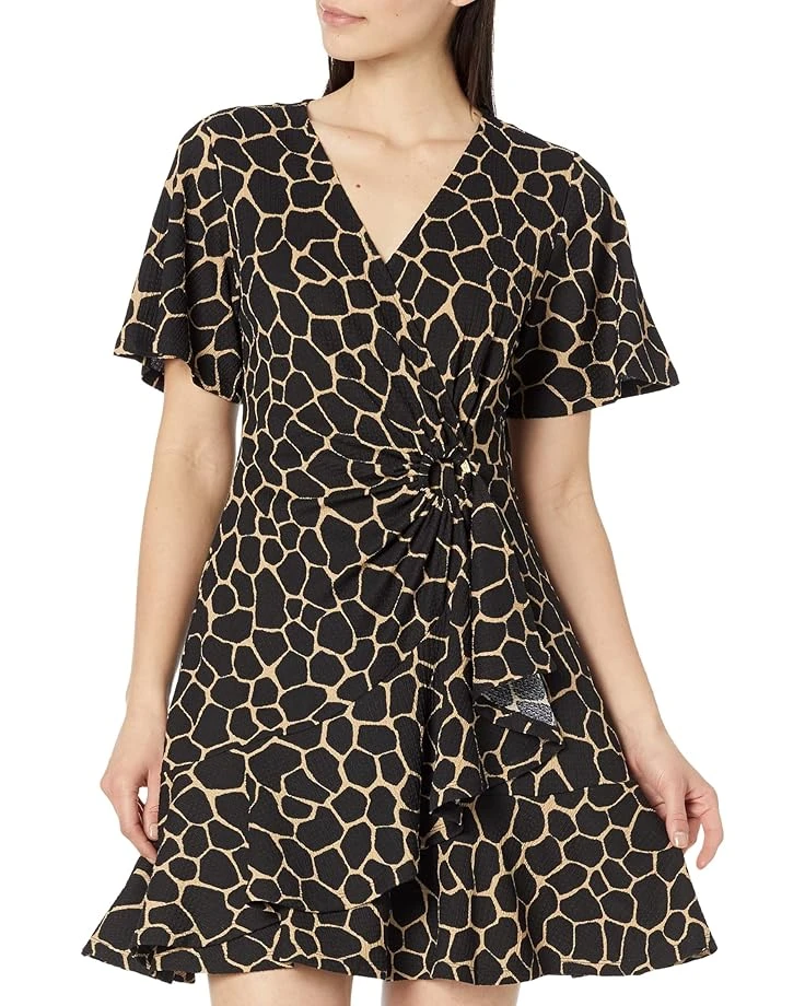 The primary materials that compose this product contain a minimum of 20 percent recycled content.SKU: #9853540Featuring a paisley faux eyelet knit fabrication, the MICHAEL Michael Kors® Giraffe Flutter Mini Wrap Dress comes with an allover printed design.Surplice neckline with short sleeves.Center back invisible closure.Drape faux wrap front with ring detailing.Shell: 50% polyester, 50% elastane;