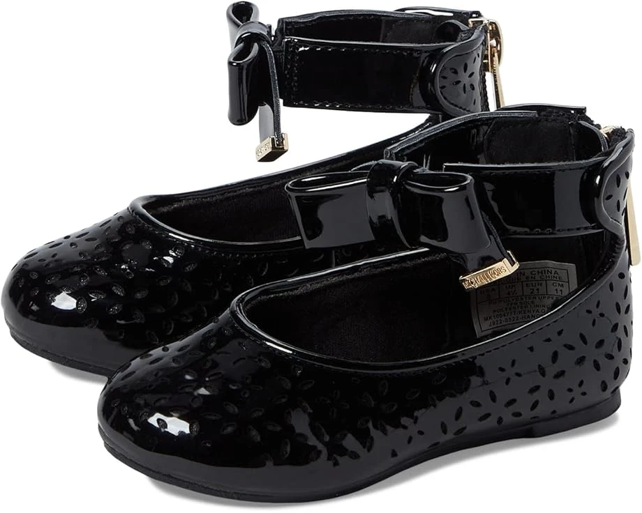 Fashioned with a chic design, the MICHAEL Michael Kors® Kids Kenya Garcia flats are truly an essential staple for your kids’ wardrobe. SKU: #9732156Glossy PU upper. Breathable polyester lining with lightly cushioned insole for added comfort.Zippered closure on the heel tab. Round toe design. Laser cutout detailing throughout the upper. Ankle strap with bow tie detailing. Flat silhouette. Flexible rubber outsole. Imported. Product measurements were taken using size 5 Toddler, width M. Please note that measurements may vary by size.Weight of footwear is based on a single item, not a pair.Measurements: