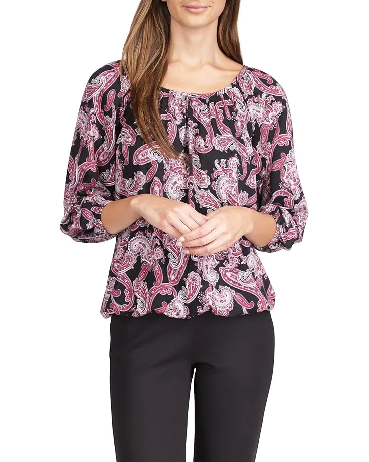 The primary materials that compose this product contain a minimum of 20 percent organic content.SKU: #9866519Add that missing charm to your basic everyday look wearing the MICHAEL Michael Kors® Petite Paisley Peasant Top.Regular fit.Wide, rounded neckline.Three-quarter sleeves with elasticized cuffs.Allover bold and beautiful paisley print.Pullover style.58% organic cotton, 38% viscose, 4% elastane.Machine wash cold, dry flat.Imported.