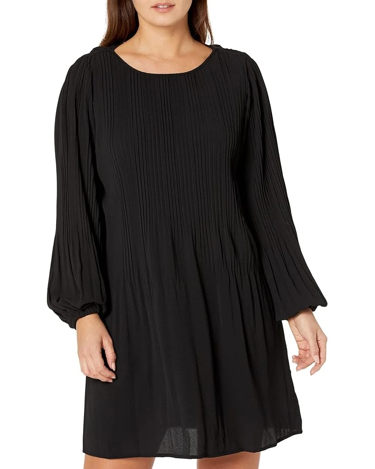 Round neckline and long sleeves with elasticized cuffs.Pleated skirt with a straight hem.
