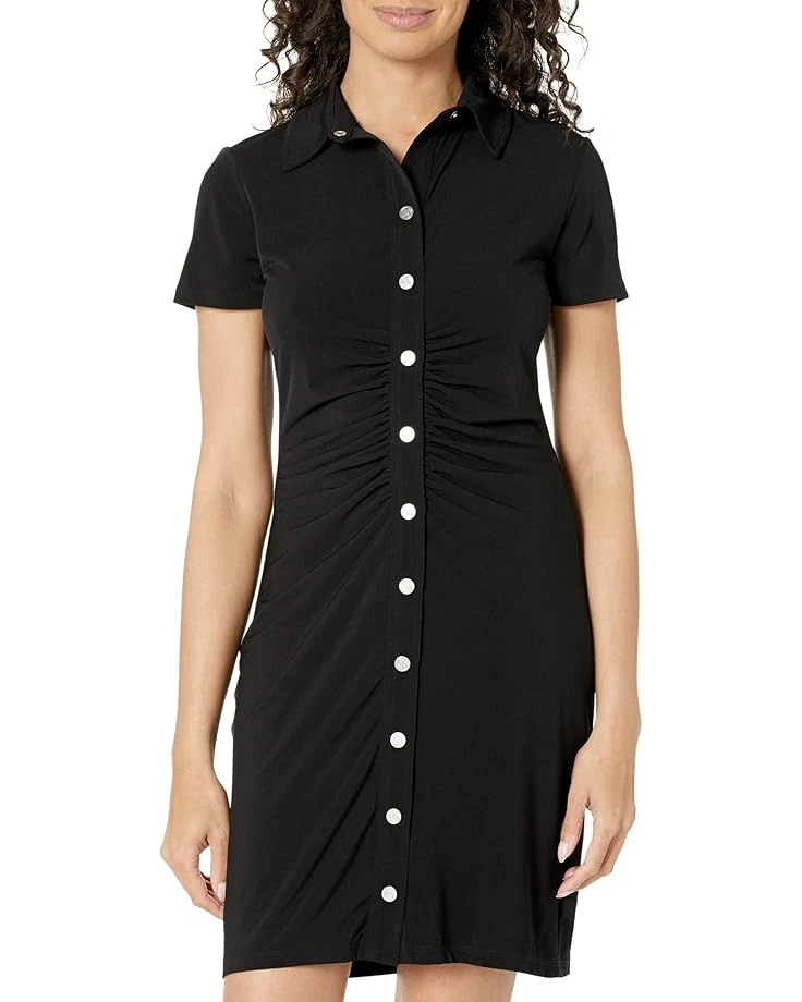 Be exclusive, be divine and be confident wearing the MICHAEL Michael Kors® Short Sleeve Snap Ruched Mini Dress.SKU: #9869011Bodycon silhouette.Point collar.Short sleeves.Button closures down front.Flattering ruching.95% polyester, 5% elastane. Machine wash, dry flat or dry clean.Imported.Product measurements were taken using size SM. Please note that measurements may vary by size.Measurements: