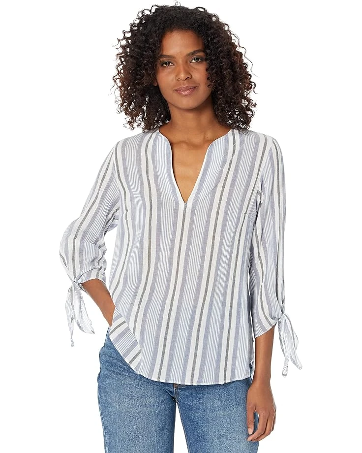 Stay comfortable and stylish with the MICHAEL Michael Kors® Vacay Stripe Tie Top. SKU: #9726550V notched neckline. 3/4 length sleeves with self-tie closures. Striped patterning throughout. Fluttery shirttail hemline. 98% cotton, 2% metallic fibers. Dry clean. Imported. Product measurements were taken using size SM. Please note that measurements may vary by size.Measurements:
